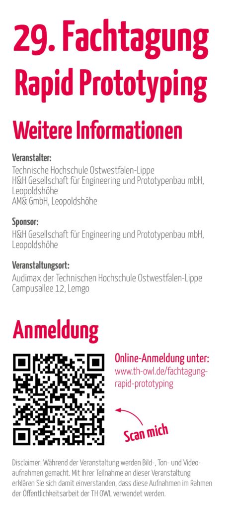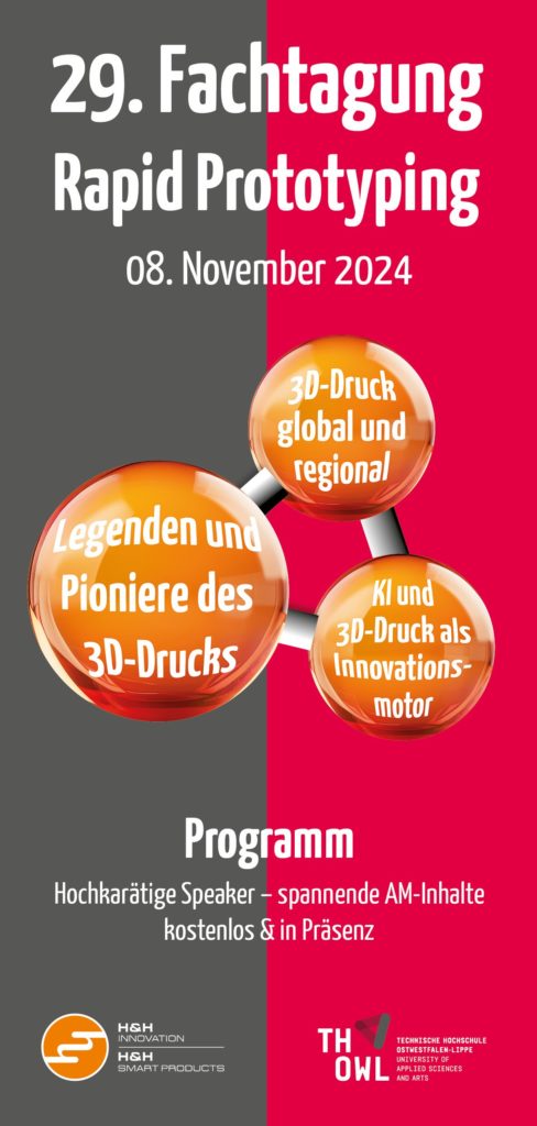 Seit ihrer Premiere im Jahr 1996 wird die Fachtagung Rapid Prototyping von derTH OWL in Zusammenarbeit mit der H&H Gesellschaft für Engineering und Prototypenbau mbH organisiert. Ziel der Veranstaltung ist es, den Austausch über die Potenziale der additiven Fertigung zu fördern und die Vernetzung in der Fachwelt voranzutreiben.